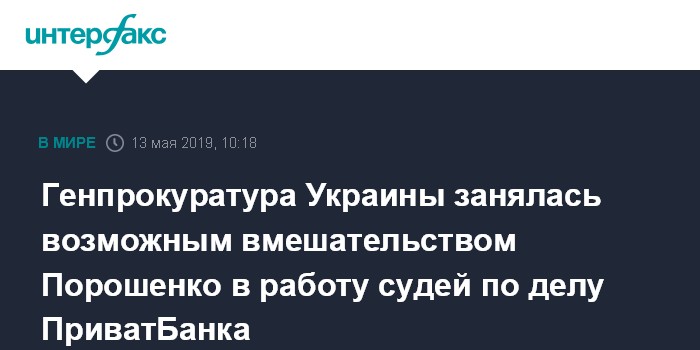 Москва. 13 мая. INTERFAX.RU - Генеральная прокуратура Украины внесла сведения в Единый реестр досудебных расследований (ЕРДР) и начала досудебное расследование по факту возможного вмешательства высших должностных лиц государства в деятельность судей во время заседания Совета национальной безопасности и обороны Украины 18 апреля по делу ПриватБанка.
