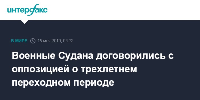 Москва. 15 мая. INTERFAX.RU - Военный совет Судана и представители альянса "За свободу и перемены" договорились об установлении трехлетнего переходного периода, сообщил телеканал Al Arabiya.