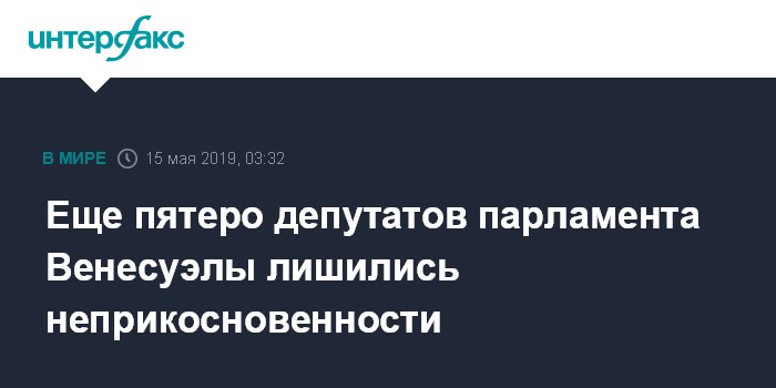 Москва. 15 мая. INTERFAX.RU - Пятеро депутатов Национальной ассамблеи (парламента) Венесуэлы от оппозиции во вторник были лишены неприкосновенности за поддержку неудавшегося государственного переворота, сообщила радиостанция Union Radio.