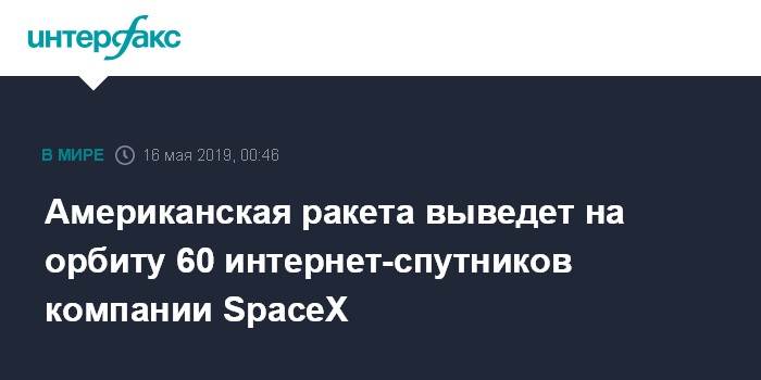 Москва. 16 мая. INTERFAX.RU - Ракета-носитель Falcon 9 в четверг должна вывести на орбиту 60 американских мини-спутников, предназначенных для начала создания глобальной сети интернет-покрытия системы Starlink, сообщила компания-разработчик SpaceX.