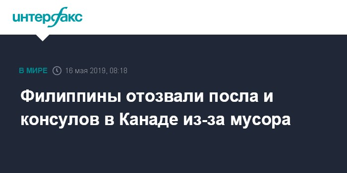 Москва. 16 мая. INTERFAX.RU - Власти Филиппин отозвали посла и консулов в Канаде из-за того, что канадское правительство не смогло начать отгрузку мусора, ввезенного на Филиппины в 2013 году.