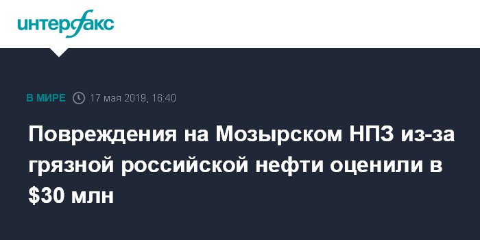 Москва. 17 мая. INTERFAX.RU - Вице-премьер Белоруссии Игорь Ляшенко сообщил, что стоимость вышедшего из строя оборудования на Мозырском НПЗ из-за поставок из РФ некондиционной нефти составляет около $30 млн.