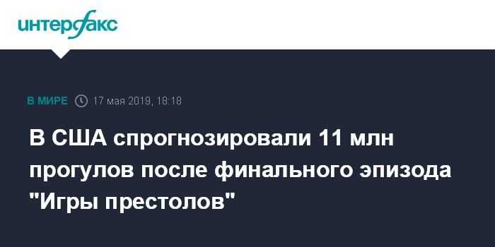 Москва. 17 мая. INTERFAX.RU - Примерно 10,7 млн американцев не пойдут на работу на следующее утро после выхода заключительного эпизода сериала "Игра престолов", который будет показан вечером в воскресенье, 19 мая, подсчитал аналитический центр Workforce Institute at Kronos (США).