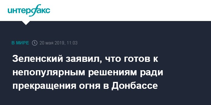 Москва. 20 мая. INTERFAX.RU - Президент Украины Владимир Зеленский заявил, что видит своей первейшей задачей прекращение боевых действий в Донбассе. По его словам, ради этого он готов на принятие непопулярных решений, вплоть до тех, которые приведут к его отставке с поста главы украинского государства.