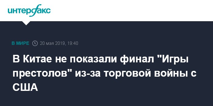 Москва. 20 мая. INTERFAX.RU - Фанаты сериала HBO "Игра престолов" в Китае не смогли увидеть финал телесаги из-за торговых споров между США Китаем, сообщает в понедельник газета The Wall Street Journal. Китайские пользователи платформы Tencent Video, которая эксклюзивно транслирует контент HBO в Китае, вместо последней серии увидели уведомление о "проблемах с каналом передачи".