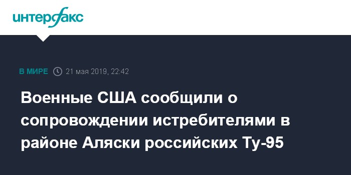 Москва. 21 мая. INTERFAX.RU - Американские военные сообщили во вторник о сопровождении самолетами ВВС США российских стратегических бомбардировщиков Ту-95 в районе Аляски.