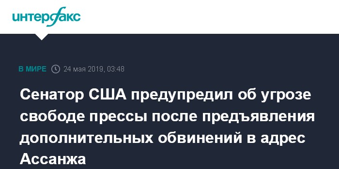 Москва. 24 мая. INTERFAX.RU - Сенатор-демократ Рон Уайден выразил обеспокоенность в четверг по поводу дополнительных обвинений против основателя Wikileaks Джулиана Ассанжа, связанных с незаконным получением и обнародованием данных, имеющих отношение к обороне США.