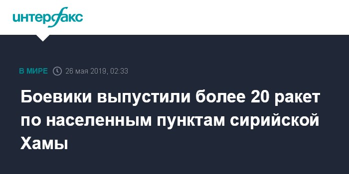 "Утром 25 мая 2019 года боевики террористической организации "Хайат Тахрир Аш-Шам" (запрещена в РФ) с территории Идлибской зоны деэскалации открыли огонь из реактивных систем залпового огня по населенным пунктам Айн-эль-Крум и Скальбия на севере провинции Хама. Террористами было выпущено более 20 реактивных снарядов.