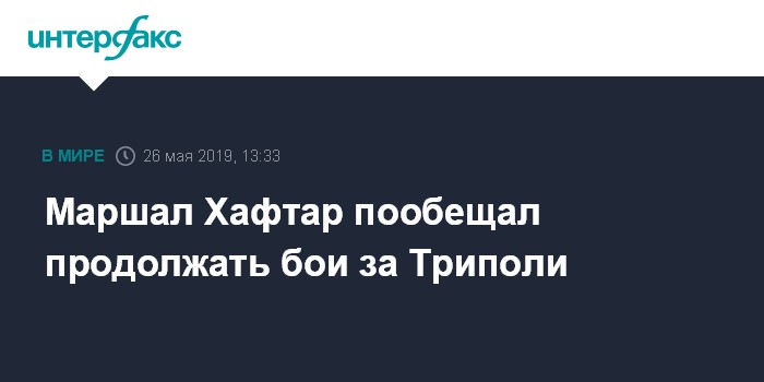 Москва. 26 мая. INTERFAX.RU - Командующий Ливийской национальной армии (ЛНА) маршал Халифа Хафтар, ведущий военное наступление против признанного ООН правительства в Триполи, заявил, что он будет продолжать боевые действия, пока "ополченцы" в столице не сложат оружие.
