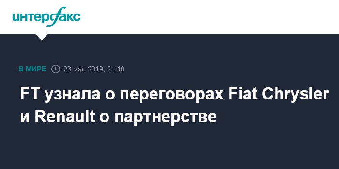 Москва. 26 мая. INTERFAX.RU - Автомобилестроительные корпорации Fiat Chrysler Automobiles и Renault SA ведут переговоры о широком партнерстве, частью которого может стать объединение значительных сегментов бизнеса, сообщает Financial Times со ссылкой на информированные источники.