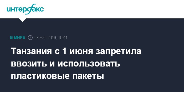 Москва. 28 мая. INTERFAX.RU - Власти Танзании с 1 июня ввели запрет на ввоз, использование и хранение пластиковых пакетов, нарушителям грозят штрафы. Об этом предупреждает ситуационно-кризисный центр (ДСКЦ) МИД РФ во вторник.