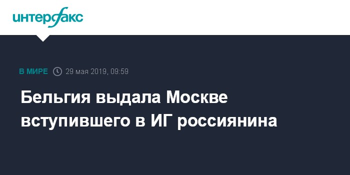 Москва. 29 мая. INTERFAX.RU - Бельгия выдала РФ россиянина, находившегося в международном розыске по подозрению в участии в войне в Сирии на стороне террористов, сообщает в среду ФСБ.