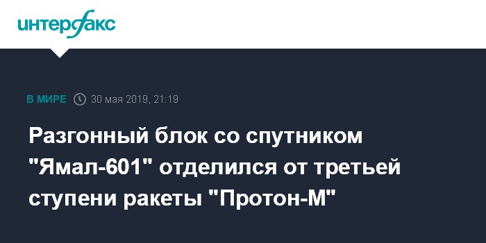 Москва. 30 мая. INTERFAX.RU - Первая, вторая и третьи ступени ракеты "Протон-М" штатно отделились от разгонного блока "Бриз-М" с новым российским телекоммуникационным спутником "Ямал-601", сообщил диктор трансляции пуска ракеты, организованной "Роскосмосом".