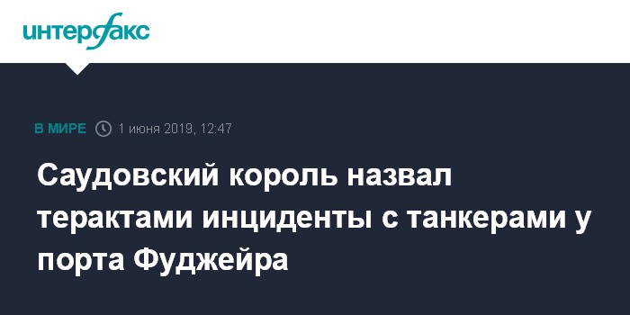 Москва. 1 июня. INTERFAX.RU - Король Саудовской Аравии Салман назвал инциденты с танкерами близ порта Фуджейра (ОАЭ) террористическими актами, которые угрожают мировым поставкам энергоресурсов, сообщает в субботу агентство Associated Press.