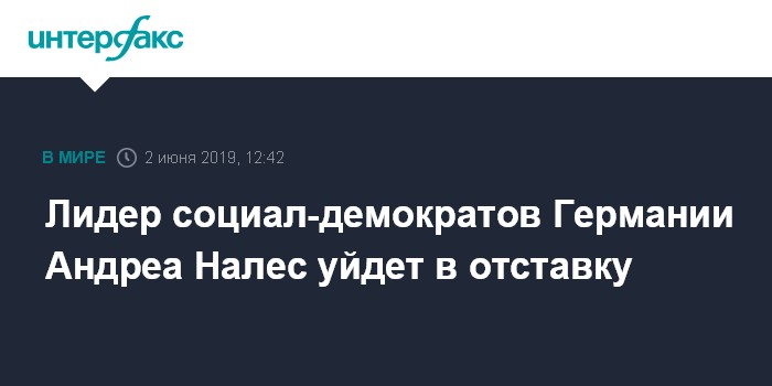 Москва. 2 июня. INTERFAX.RU - Лидер Социал-демократической партии Германии (СДПГ) Андреа Налес в воскресенье заявила, что уйдет в отставку с поста руководителя партии и с должности главы фракции СДПГ в бундестаге.