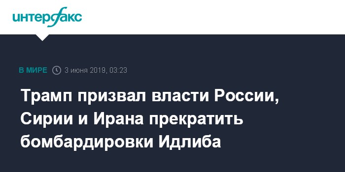 Москва. 3 июня. INTERFAX.RU - Президент США Дональд Трамп в твиттере призвал Россию, Сирию и Иран прекратить бомбардировки в сирийской провинции Идлиб.