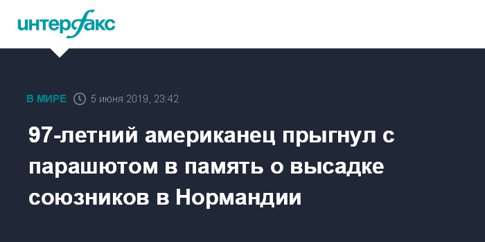 Москва. 5 июня. INTERFAX.RU - Несколько ветеранов Второй мировой войны совершили прыжки с парашютом во французской Нормандии по случаю 75-летней годовщины высадки союзников в 1944 году, сообщают местные СМИ.