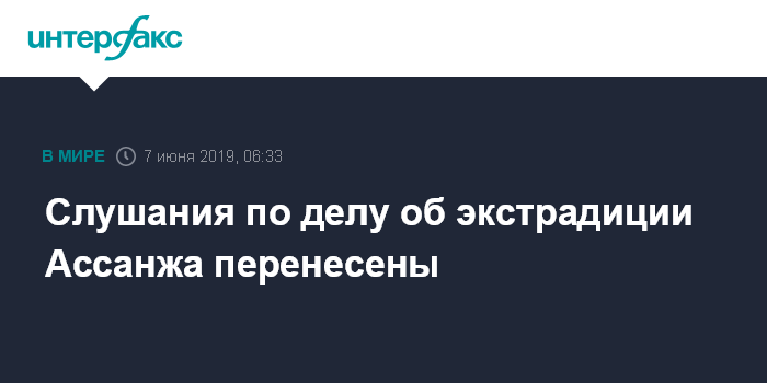 "Первое слушание по вопросу об экстрадиции в США, ранее запланированное на 12 июня, перенесено на 14 июня. Слушание пройдет в магистратском суде Белмарша", - сообщает WikiLeaks в своем Twitter.