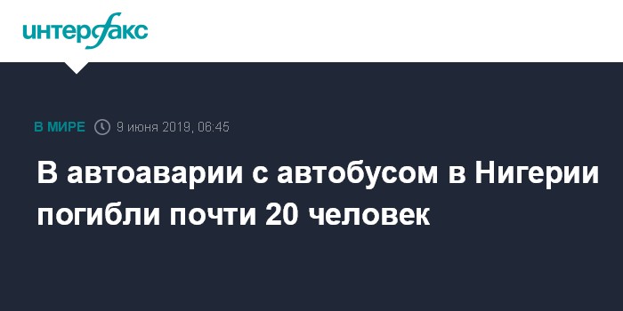 Москва. 9 июня. INTERFAX.RU - По меньшей мере 18 человек погибли в автобусе в результате дорожно-транспортного происшествия (ДТП) в Нигерии, сообщили местные СМИ. Авария произошла в минувшую субботу на скоростном шоссе в штате Ондо на юго-западе страны. По не установленной пока причине водитель грузового автомобиля выехал на полосу встречного движения, что привело к лобовому столкновению с автобусом, в котором находилось 18 человек.