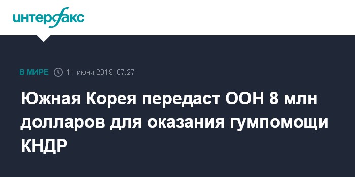 Москва. 11 июня. INTERFAX.RU - Южная Корея на этой неделе переведет на счета ООН 8 млн долларов для оказания КНДР продовольственной помощи, сообщает во вторник агентство Yonhap со ссылкой на источник в министерстве объединения, курирующем отношения с КНДР.
