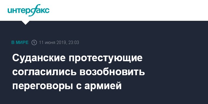 Москва. 11 июня. INTERFAX.RU - Лидеры гражданских активистов, протестующих в Судане, согласились с сегодняшнего дня прекратить кампанию неповиновения, начатую после подавления демонстраций, и возобновить переговоры с военным руководством Судана.