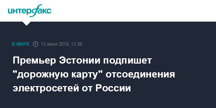 Москва. 13 июня. INTERFAX.RU - Премьер Эстонии Юри Ратас вместе с главами правительств стран Балтии, Польши и председателем Европейской комиссии подпишет на июньском заседании Совета ЕС "дорожную карту" синхронизации электросистем с ЕС и отсоединения их от России.
