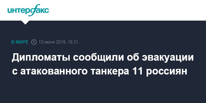 Москва. 13 июня. INTERFAX.RU - С одного из атакованных в Оманском заливе танкеров сняли 11 россиян, это десять мужчин и одна женщина, они в безопасности, заявили "Интерфаксу" в посольстве России в Тегеране.
