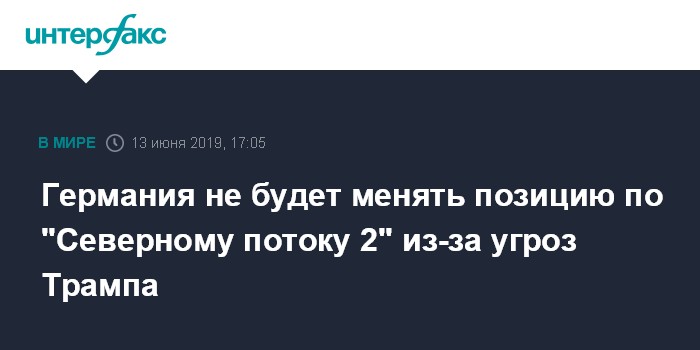 Москва. 13 июня. INTERFAX.RU - Германия знает об угрозах президента США Дональда Трампа ввести санкции в отношении проекта газопровода "Северный поток 2", однако не собирается менять свою позицию по данному проекту, сообщает агентство Bloomberg со ссылкой на слова представителя немецкого правительства Штеффена Зайберта.
