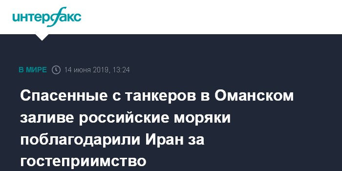 Москва. 14 июня. INTERFAX.RU - Моряки из России, находящиеся в Иране после инцидента с танкером Frontline в Оманском заливе, выразили иранцам благодарность за гостеприимство, сообщает иранский телеканал Press TV.