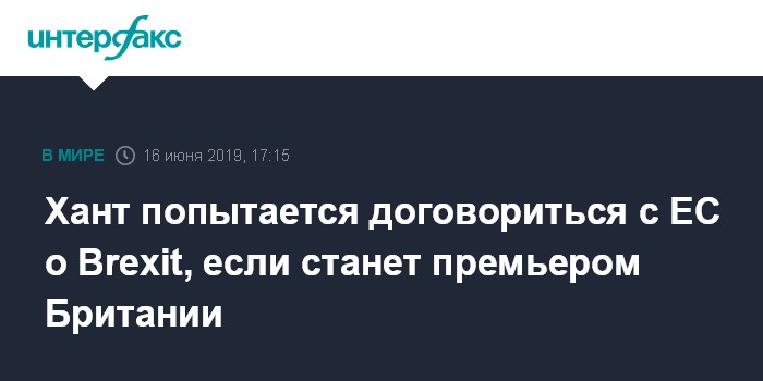 Москва. 16 июня. INTERFAX.RU - Министр иностранных дел Британии Джереми Хант заявил в воскресенье, что он намерен пытаться договориться с Брюсселем о соглашении по выходу Британии из ЕС, если его выберут лидером консерваторов, передает BBC.