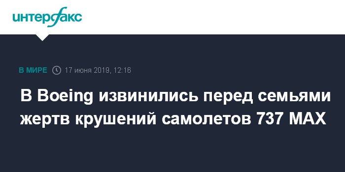 Москва. 17 июня. INTERFAX.RU - Вице-президент по маркетингу Boeing Commercial Airplanes Рэнди Тинсет принес извинения семьям людей, погибших при крушении самолетов Boeing 737 MАX авиакомпаний Lion Air и Ethiopian Airlines, передает Associated Press.