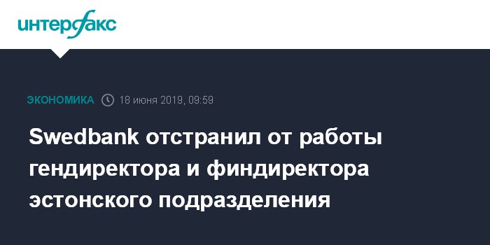 Москва. 18 июня. INTERFAX.RU - Руководство шведского банка Swedbank AB отстранило от работы главного исполнительного директора и председателя совета директоров эстонского филиала Робарта Китта и финансового директора Вайко Таммевали на фоне внутреннего расследования нарушений мер по борьбе с отмыванием средств в подразделении.