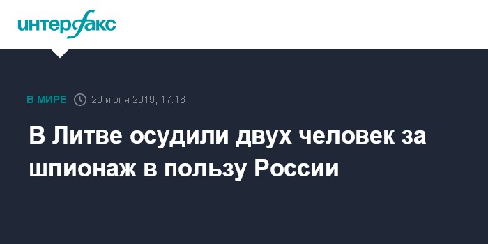 Москва. 20 июня. INTERFAX.RU - Шяуляйский окружной суд в четверг признал двух человек виновными в шпионаже в пользу России и назначил им наказание в виде лишения свободы по четыре года и девять месяцев. Об этом сообщил агентству BNS представитель суда по связям с общественностью Витаутас Йончас.