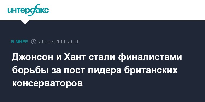 Москва. 20 июня. INTERFAX.RU - Экс-глава МИД Великобритании Борис Джонсон и глава МИД Великобритании Джереми Хант продолжат борьбу за руководство Консервативной партией Великобритании, объявили в четверг в парламенте страны.