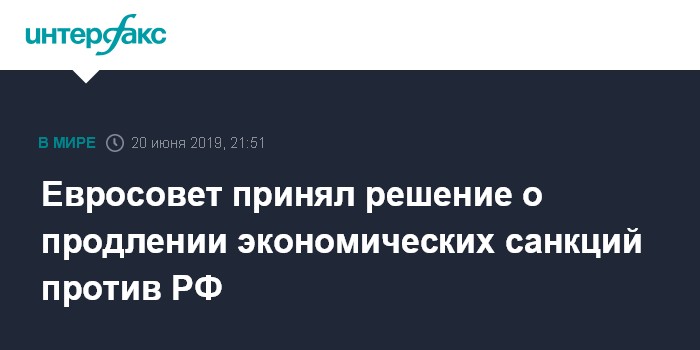 Москва. 20 июня. INTERFAX.RU - Официальный представитель председателя Европейского совета Дональда Туска Пребен Ааманн сообщил в твиттере, что участники заседающего в Брюсселе саммита ЕС договорились о продлении на полгода экономических санкций в отношении России.