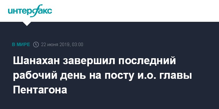 Москва. 22 июня. INTERFAX.RU - И.о. главы Пентагона Патрик Шанахан в пятницу провел последний рабочий день в этой должности.