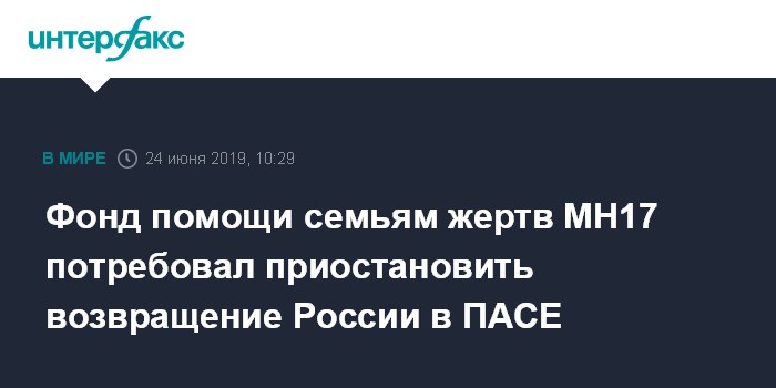 Москва. 24 июня. INTERFAX.RU - Нидерландский фонд Stichting Vliegramp MH17 созданный для помощи семьям погибших в самолете, сбитом под Донецком в 2014 году, потребовал отложить возвращение России в Парламентскую ассамблею Совета Европы. Об этом говорится в его письме в ПАСЕ, пишет газета Telegraaf.