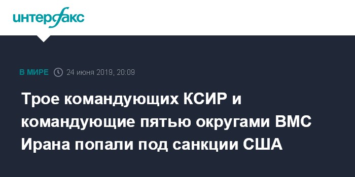 Москва. 24 июня. INTERFAX.RU - США ввели санкции в отношении иранских военачальников, в том числе командующих силами Корпуса стражей Исламской революции (КСИР), сообщил министр финансов США Стивен Мнучин.