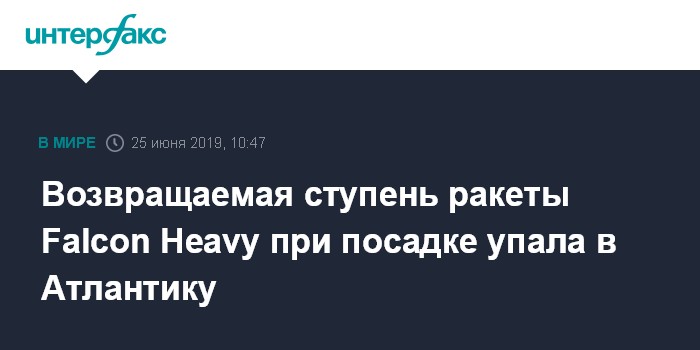 Москва. 25 июня. INTERFAX.RU - Неудачей завершилась попытка управляемой посадки на плавучую платформу в Атлантике многоразовой первой ступени американской ракеты Falcon Heavy, стартовавшей ранее во вторник на орбиту, сообщила компания-разработчик SpaceX.