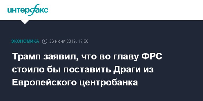 Москва. 26 июня. INTERFAX.RU - Президент США Дональд Трамп предпринял очередную атаку на Федеральную резервную систему (ФРС), назвав ее политику необдуманной и заявив, что во главе ФРС стоило бы поставить главу Европейского центрального банка (ЕЦБ) Марио Драги.