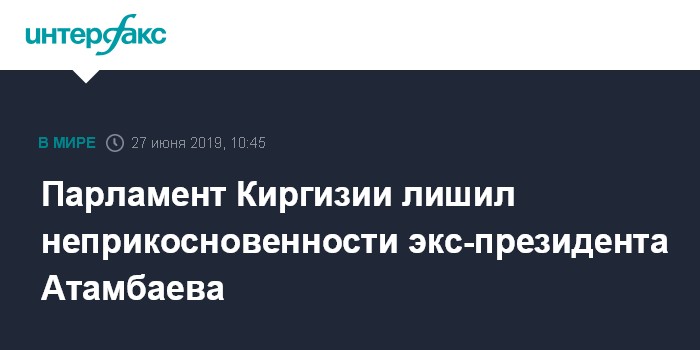 Москва. 27 июня. INTERFAX.RU - Депутаты парламента Киргизии в четверг большинством голосов приняли решение о снятии неприкосновенности с экс-президента Алмазбека Атамбаева за действия на посту главы государства, в которых Генпрокуратура нашла признаки коррупции, сообщает корреспондент "Интерфакса".