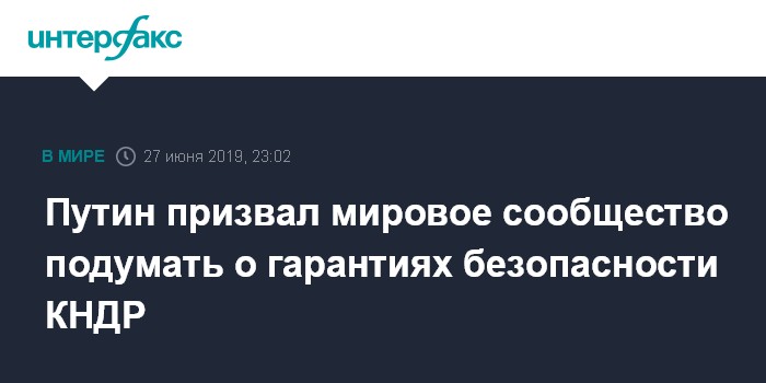 Москва. 27 июня. INTERFAX.RU - Мировое сообщество в настоящее время должно думать не о разоружении КНДР, а о гарантиях безопасности этой страны в соответствии с международным правом, считает президент РФ Владимир Путин.