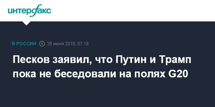 Москва. 28 июня. INTERFAX.RU - Президент РФ Владимир Путин и президент США Дональд Трамп пока не беседовали на полях "двадцатки" в Осаке, сообщил "Интерфаксу" пресс-секретарь главы государства Дмитрий Песков.