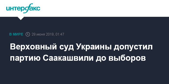 Москва. 29 июня. INTERFAX.RU - Верховный суд Украины отклонил апелляционную жалобу Центральной избирательной комиссии (ЦИК) страны по вопросу об участии партии "Рух новых сил" экс-президента Грузии Михаила Саакашвили во внеочередных парламентских выборах 21 июля. Об этом говорится в фейсбуке партии.