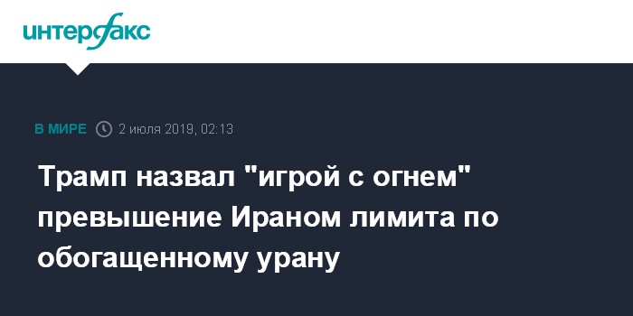 Москва. 2 июля. INTERFAX.RU - Президент США Дональд Трамп заявил, что решение Ирана превысить оговоренный Совместным всеобъемлющим планом действий (СВПД) лимит запасов низкообогащенного урана - это "игра с огнем", приводит его слова The Hill.