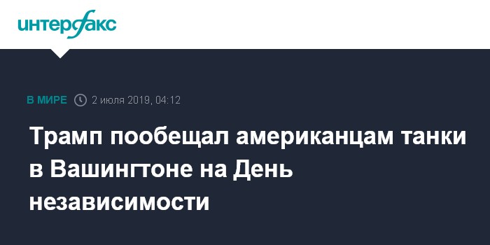 Москва. 2 июля. INTERFAX.RU - Президент США Дональд Трамп заявил, что в Вашингтоне в военном параде по случаю Дня независимости 4 июля будут участвовать танки, передает Associated Press.