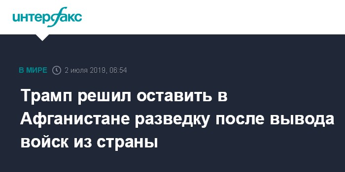 Москва. 2 июля. INTERFAX.RU - Президент США Дональд Трамп заявил, что сохранит разведывательное присутствие в Афганистане, хотя он давно желает полностью вывести американских военных из страны.