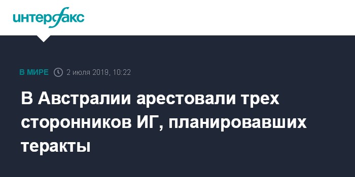 Москва. 2 июля. INTERFAX.RU - Австралийские службы безопасности арестовали трех человек, подозреваемых в подготовке серии терактов в Сиднее от имени группировки "Исламское государство" (ИГ, запрещена в РФ), передает во вторник агентство Associated Press со ссылкой на помощника комиссара полиции Австралии Йена Маккартни.
