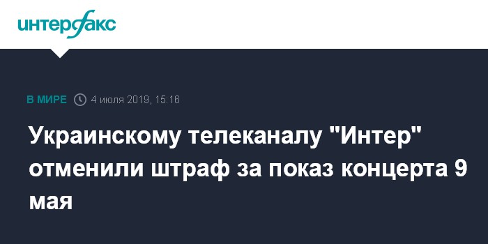 Москва. 4 июля. INTERFAX.RU - Киевский суд отменил штраф, назначенный телеканалу "Интер" за трансляцию концерта, приуроченного к Дню Победы 9 мая 2018 года, сообщает в четверг канал.