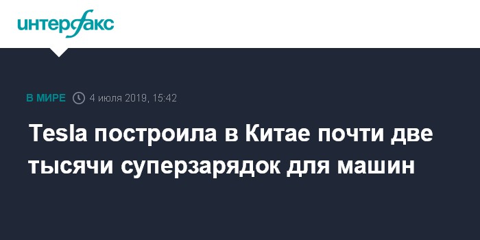 Москва. 4 июля. INTERFAX.RU - Американский производитель электромобилей Tesla построил в Китае более 1,7 тысяч устройств для быстрой зарядки машин, сообщает информагентство Хinhua.